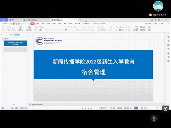 为加强新生宿舍管理和安全教育,提高学生安全意识,营造和谐融洽的宿舍环境,88直播app 11月10日组织开展2022级本科新生宿舍安全教育培训会。会议通过线上方式开展,由2022级辅导员刘璇主讲,2022级本科新生全体宿舍长参会。