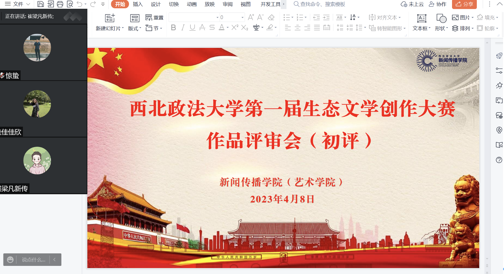 4月8日下午,88直播app 团委举行西北政法大学第一届生态文学创作大赛作品初评会,学院团委书记巩飞、团总支书记崔梁凡、团委兼职副书记李佳欣参加评审,评审会以线上会议的方式召开。