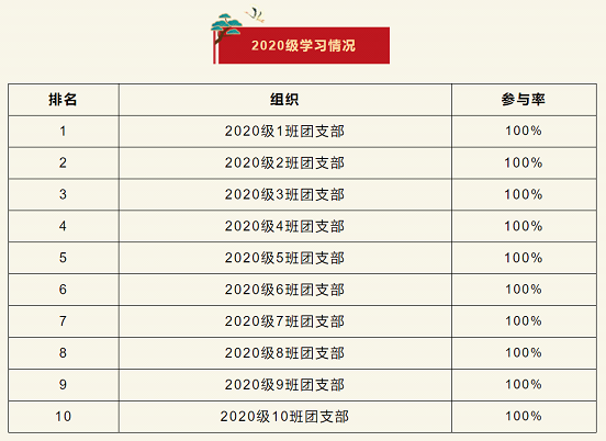 在上一期“青年大学习”网上主题团课的学习中,2020级所有团支部全部完成!