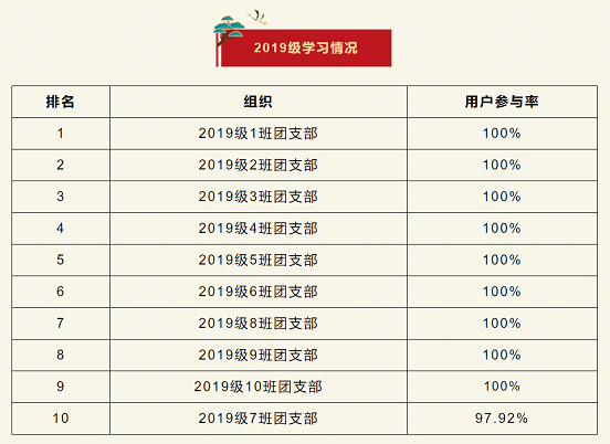 在上一期“青年大学习”网上主题团课的学习中,2019级1、2、3、4、5、6、8、9、10班团支部位居榜首。