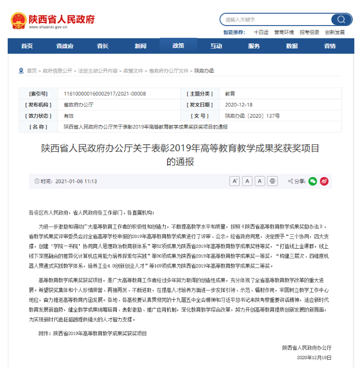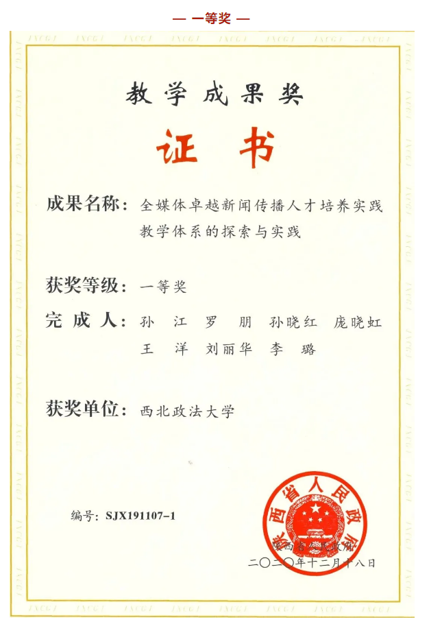 近日,陕西省人民政府办公厅发布了《关于表彰2019年高等教育教学成果奖获奖项目的通报》(陕政办函〔2020〕137号),我校获得省级教学成果奖7项,其中特等奖1项、一等奖2项、二等奖4项,获奖数量和等级均创学校历史最好成绩。其中,88直播app下载安卓版 “全媒体卓越新闻传播人才培养实践教学体系的探索与实践”获得一等奖。