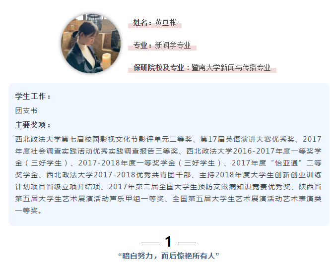 大学生活像是温水煮青蛙。很多人在安逸的日子中渐渐迷失方向,忘记来时之路,也忘记去往何方。四年一晃而过,一些看似努力生活的人,最终变得懒散而思维疲化,甚至不如高考时的意气风发。不当温水里的青蛙,怎么做?采访黄亘枨的时候,她说到:大学有很多种活法,没有哪种是最好的,你可以玩儿的很好,也可以学的很好,关键在于你要的是什么。“要保研就准备好各种加分项和成绩,要考研就好好看论文看热点,要工作就参加各种比赛和实践。”不骄不躁,忙而不盲。在大学的小气候里,黄亘枨得到了充分的锻炼。由于生病,黄亘枨休学了一年。“休学之后就没得到国奖,复学之后回来根本没抱希望自己能保研,但是还是想着试一把。”其间,她刚好碰上2016和2017级培养方案大变动,很多课程不一样,为了把课程修满,一学期上八门必修课,还有四门选修课。那时候在黄亘枨心里,比保研更重要的,是如何让自己学得更多变得更优秀。回望自己在复学后的那段时间,黄亘枨感慨万千,“感觉就像住在图书馆了,那段时间跟打仗一样。”她坐在图书馆与其他人共同学习,用别人的学习的氛围感染自己,帮助自己尽快静下心来,努力学习,一点一点补完该补的知识空缺。在学校课程之外,黄亘枨还在准备雅思考试。每天挤时间学习英语,食堂、教室的路上反复听听力磨耳朵,在完全碎片化的学习过程中,英语反而不断进步。