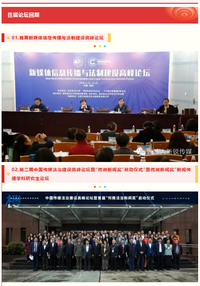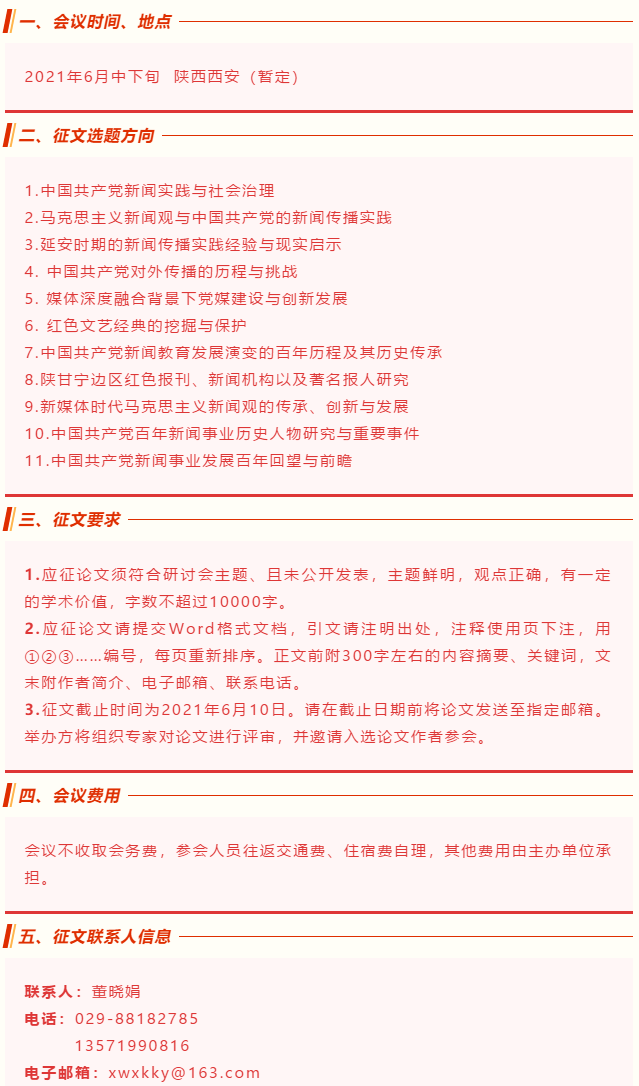 值此华诞,西北政法大学、中国新闻史学会新闻传播教育史专业委员会、中华全国法制新闻协会法制新闻理论专业委员会和中国互联网协会网络文化与新媒体委员会共同主办,拟于2021年6月中旬以“中国共产党新闻传播理论与实践:历史、现实与展望”为主题,举办第五届“何微新闻奖”新闻传播学科研究生论坛暨青年学者论坛。