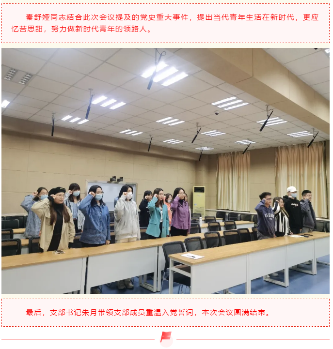 随后,朱月同志带领大家回顾新民主主义革命时期中国共产党史上的重大事迹,引导大家深刻铭记中国共产党百年奋斗的光辉历程,感受在党的领导下中国发生的巨大变化。通过明晰先辈们在新民主主义革命期间为党和人民做出的贡献,启示我辈以身作则,牢记使命,在现实生活中做好表率、当好示范。