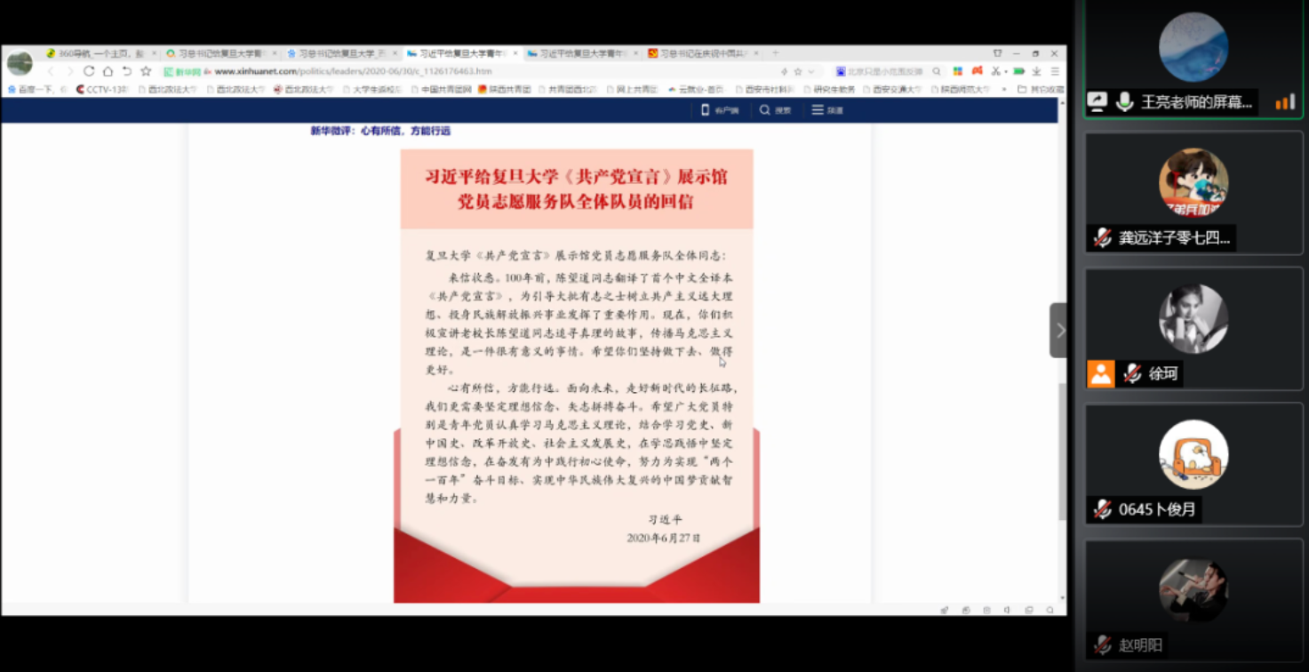 在学院党委指导下,学院团学干部在2016级辅导员王亮的带领下共同学习领会习近平总书记给复旦大学《共产党宣言》展示馆党员志愿服务队全体队员的回信精神。王亮要求大家结合习近平总书记来陕考察重要讲话重要指示精神和给高校师生历次重要回信和指示批示精神系统学、深入学、带着问题学,努力做到真学真信、真懂真用,确保学习效果。在各班班级群内,大家谈感受、说体会,用一篇篇感情真挚的推送,表达自己的祝福。2019级广播电视学专业学生张卓表示,在中国共产党成立99周年之际,能够分享党课学习中的认识,讲述共青团员的担当,我感到骄傲。党员两个字,不仅是一个头衔与荣誉,更是一份使命与担当。一个共产党员的力量是有限的,千千万万的共产党员同心协力,涓滴汇海,这份力量就会变得非常巨大。