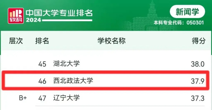 新闻学专业层次B+,得分37.9分,全国排名第46名,位列陕西省入选高校第三。