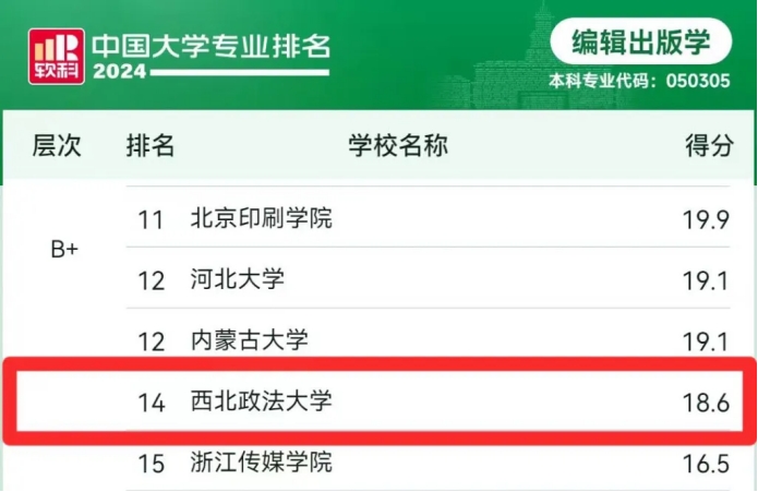 编辑出版学专业层次B+,得分18.6分,较2023年前进1位,全国排名第14名,位列陕西省入选高校第二。