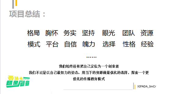 卓越传媒人才 基地的团队成员也有这些品质,但他们从未将自己定位成一个创业者,而是协同基地资源探索一种优化的传媒教育模式,但他坚信基地团队成员中未来会出现很多个 创业者。