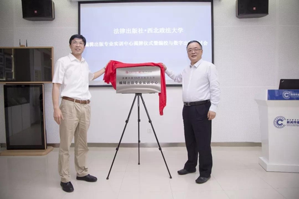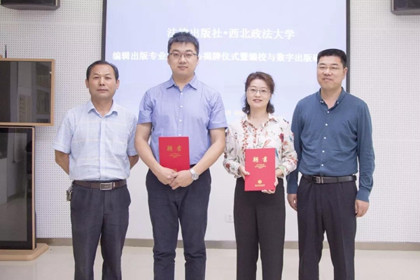 王麟副校长和法律出版社社长助理张宇东共同揭牌。教务处副处长李永宁与88直播app 副院长王俊荣为班运华和周洋两位老师颁发实务导师聘书,“法律出版社—西北政法大学编辑出版专业实训中心”正式挂牌成立。