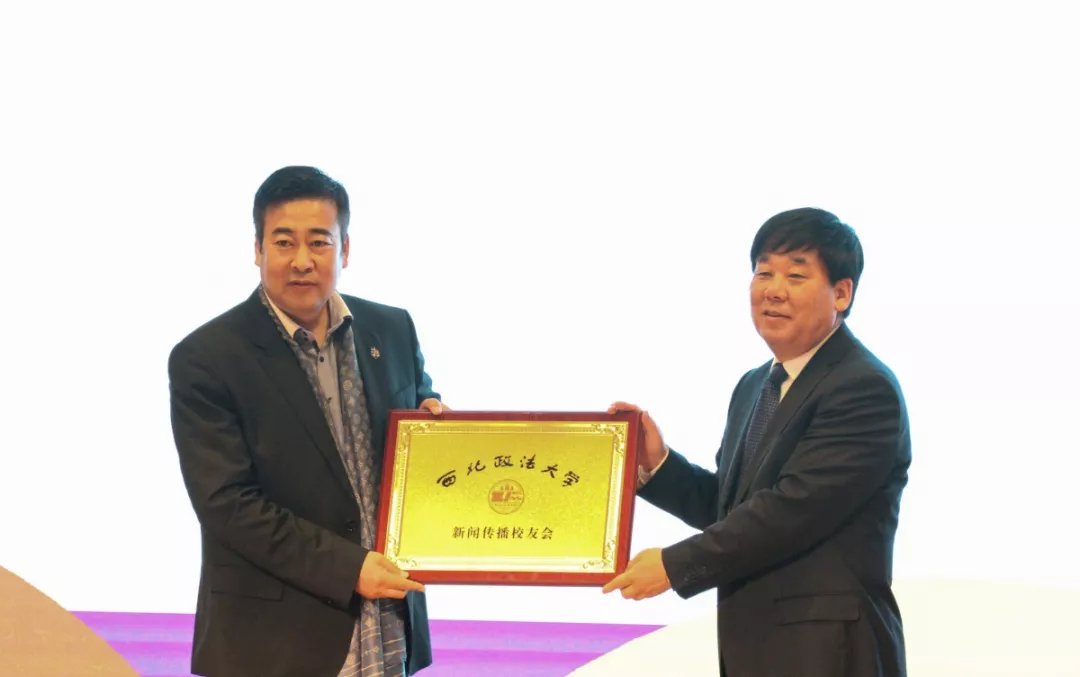 西北政法大学校长、校友总会会长杨宗科教授向西北政法大学新闻传播校友会成立授牌