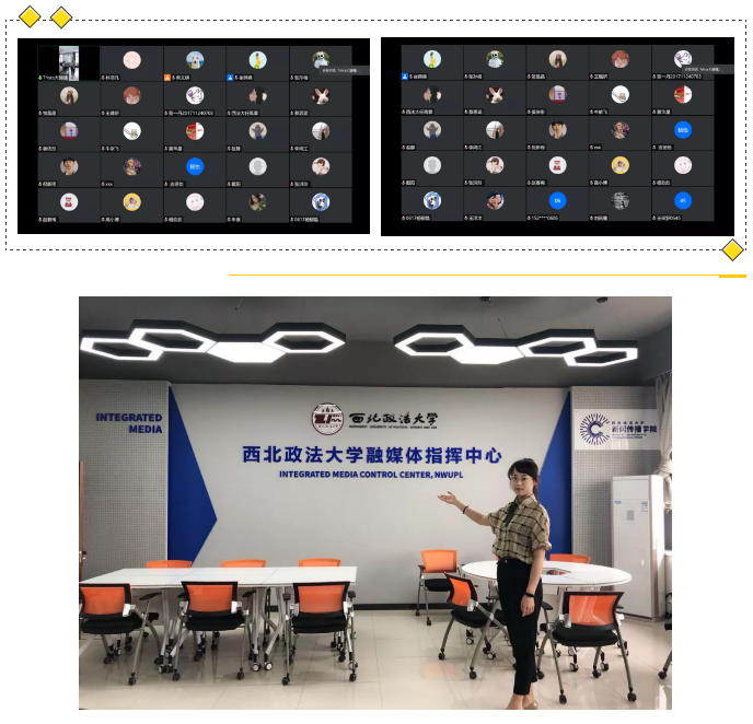 会议直播开始后,在王婧臻老师的指引下,大家共同参观了南校区的各个实验室,包括电子采编实验室、非线性编辑实验室、融媒体指挥中心、录音室、设备间、演播厅等。其中,非编工作站是88直播app下载安卓版 产学研合作办学模式的新探索,由中广上洋公司提供设备;同时,在学生实践中,88直播app下载安卓版 院媒西法大radio也与校外的社会广播电台多有合作,制作了“青春直播间”等特色节目。