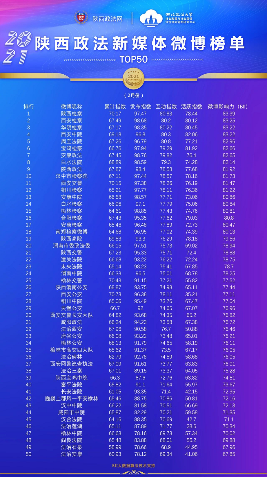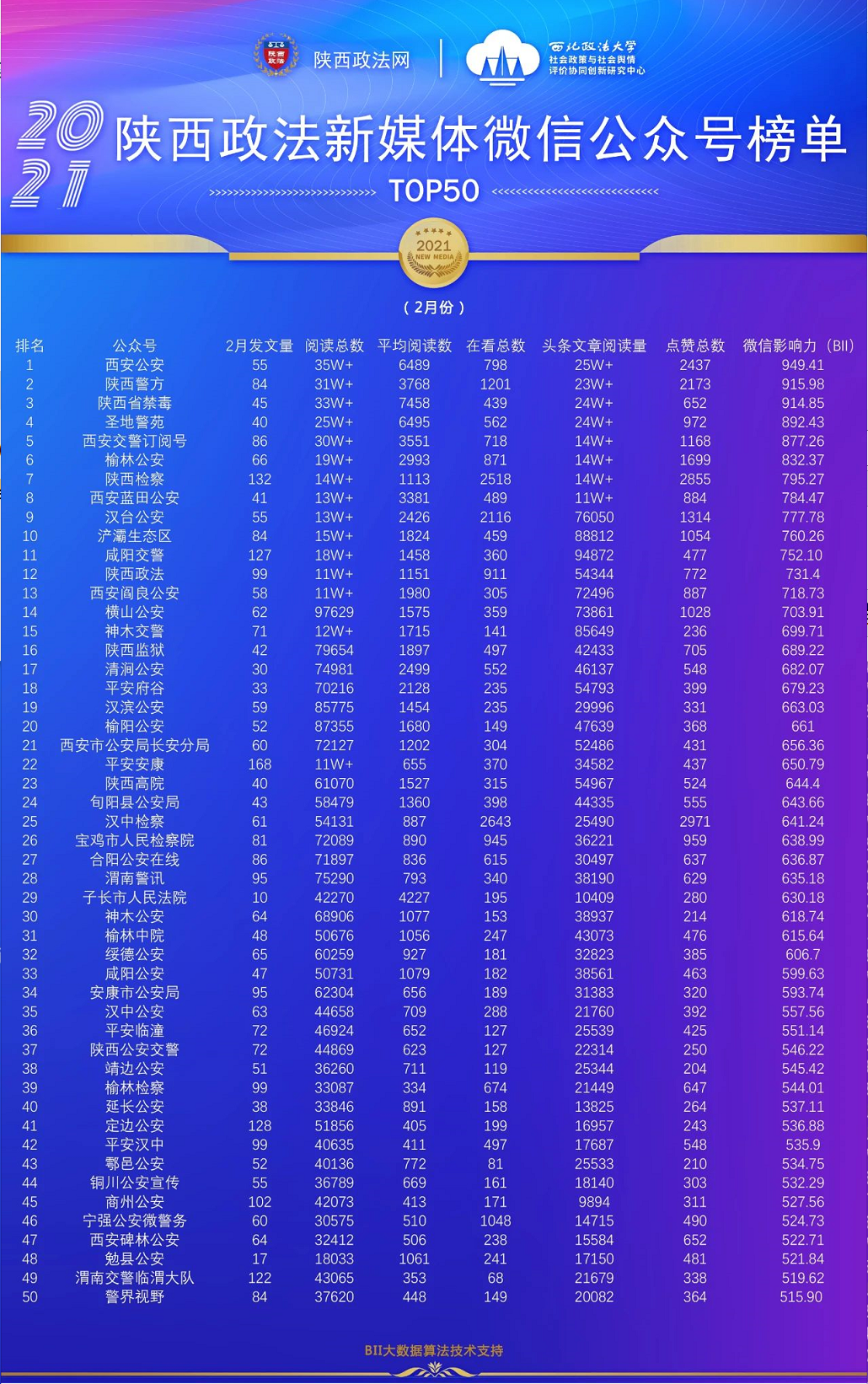 TOP50-榜单说明:陕西政法网联合“西北政法大学社会政策与社会舆情评价协同创新研究中心”和“新浪微热点大数据研究院”对2021年2月全省政法系统发布的新媒体内容进行数据抓取,结合政法新媒体账号发布量、阅读量、互动量、粉丝量、点赞量、转发量、评论量等多维度作为主要计算参数进行评选。本期陕西政法新媒体账号榜单有5个,即:微信公众号榜单、微博榜单、头条号榜单、视频类榜单、资讯类账号榜单。