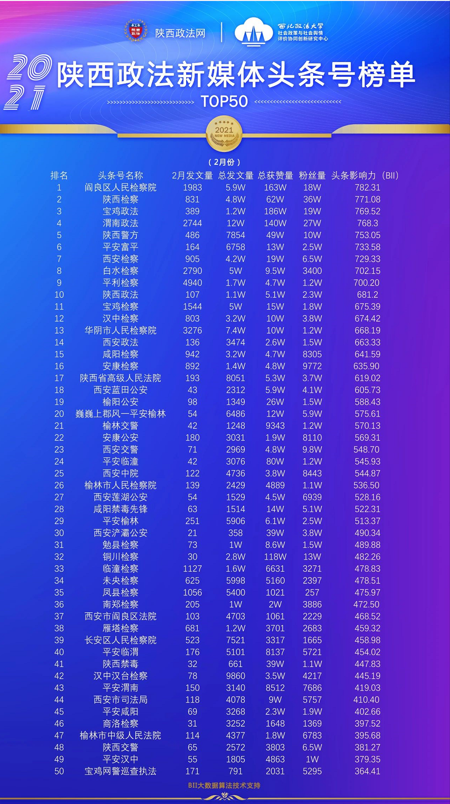 重磅来袭!陕西政法新媒体账号2021年2月榜单发布