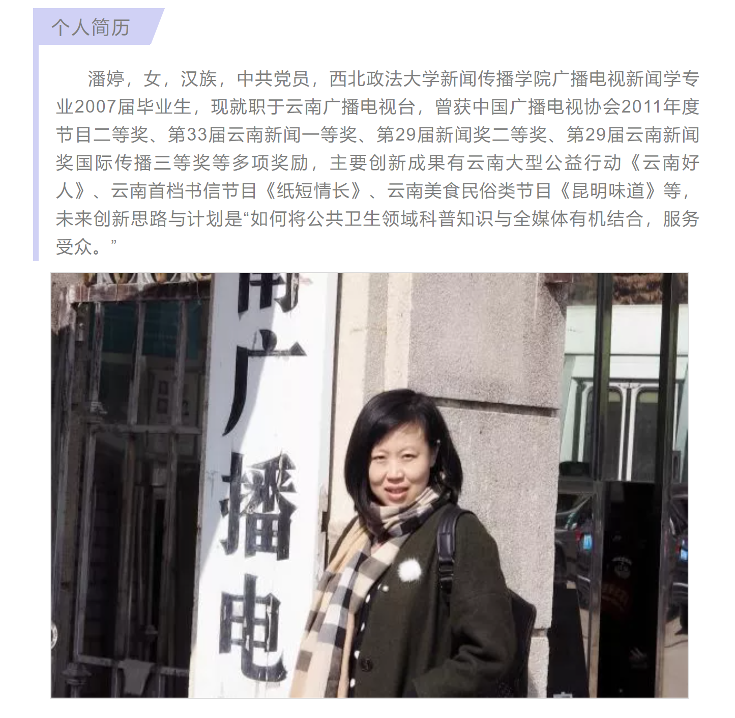 2007年大学毕业,潘婷就有着让自己成为一名记者的愿望,这个愿望在她21岁时得以实现,“在云南广播电视台的大厅,我穿上《都市条形码》的工作服,拿起采访话筒的那瞬间,我第一次深刻感受到责任在肩。”一名小记者,拿什么让人信任?潘婷认为只有肩负起记者的责任,深入一线,有质量、有深度的报道被看见,才会有被信任的可能。