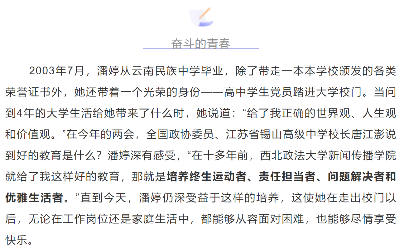 如今,潘婷成为一名记者,心中依然存有这份责任与希望,从未改变。它不是镜头前的光鲜亮丽,而是在寻求真相过程中不被看到的泥泞与艰难。新闻是明天的历史,历史是昨天的新闻,让温情为懦弱赋能,让温暖为僵硬松绑,这便是记者的责任与担当。在10多年前,潘婷就在老师和母校的教导下收获了这份责任与担当。