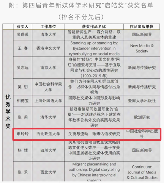 第四届青年新媒体学术研究“启皓奖”评选结果近日揭晓,88直播app 副教授申玲玲凭借作品《失衡与流动:微博话语权研究》荣获优秀学术奖。
