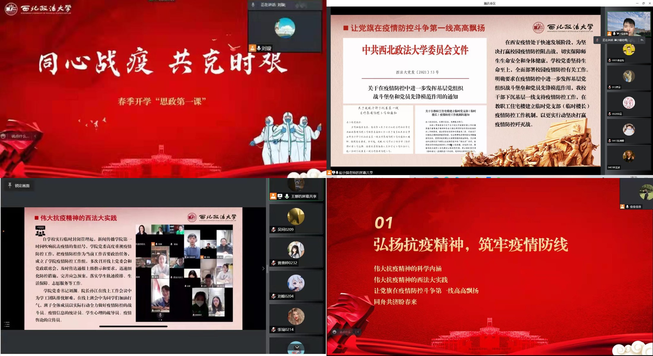 党员志愿者闻令而动,冲锋在前,用实际行动擦亮党员底色。学院本科生第二党支部预备党员张紫翾认为,此次思政第一课深入学习了西法大人在突如而来的疫情时的使命担当,我们青年更应用勇气、智慧和理性不断迎接各种挑战,正确面对疫情,坚决配合防控,为打好疫情攻坚战付出自己的行动。